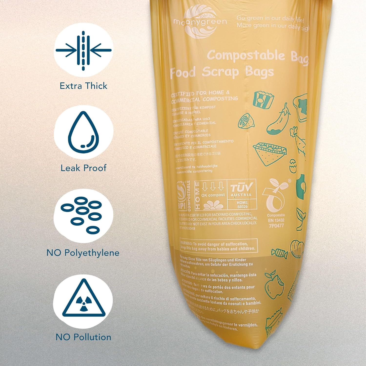 - ā Moonygreen is one-stop solution for you : Moonygreen food scrap bags are Super-Thick, strong enough for household. The special design offer you ease in tearing off the bags. Non-Toxic feature makes you feel more secure when you use our bags. With Moonygreen, you can get a High-quality experience while protecting our Earth!