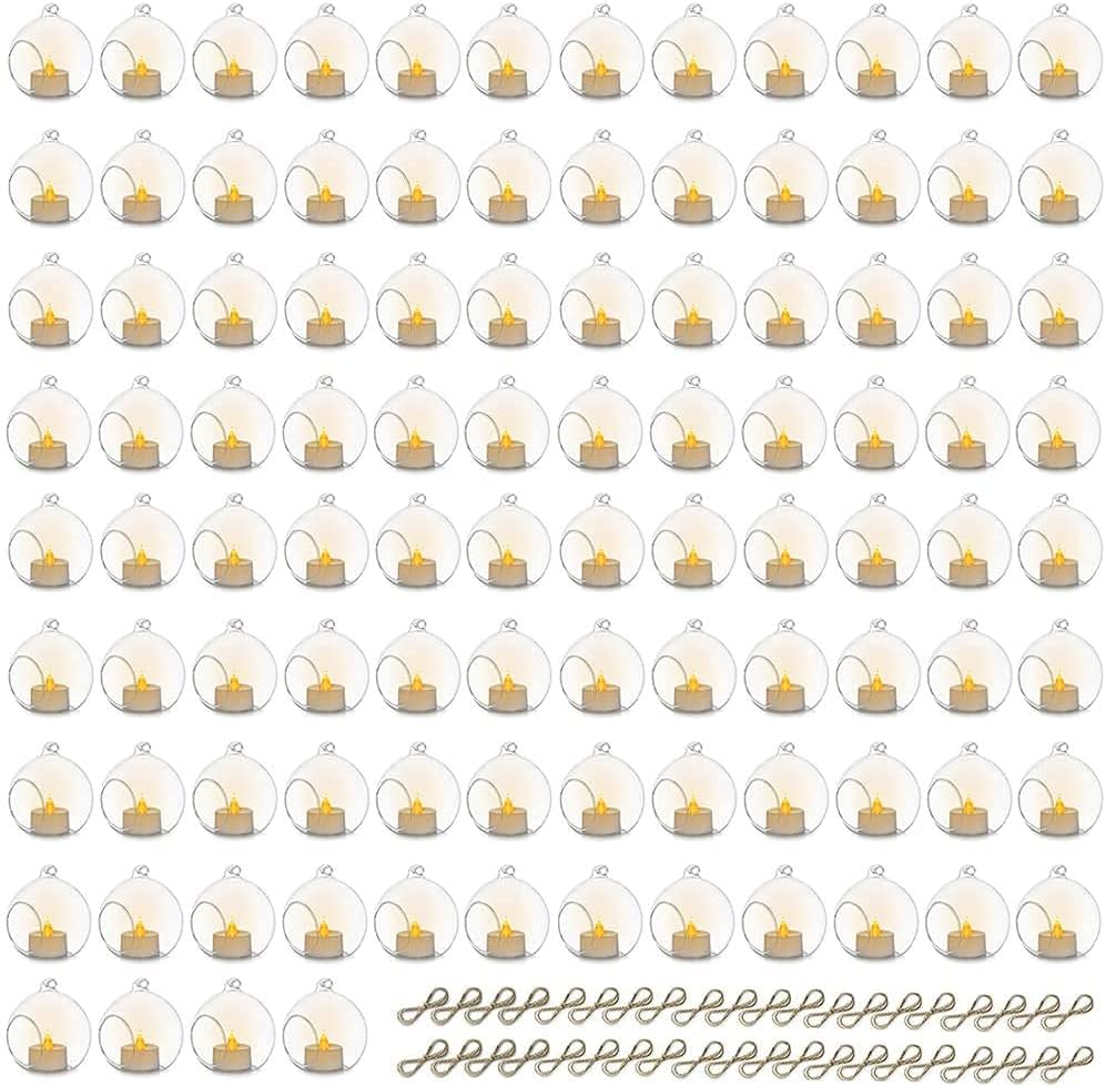 Sziqiqi Hanging Glass Globes Orbs Tea Light Candle Holders with Flameless LED Tealight for Wedding Ornaments Wedding Birthday Christmas Party Centerpiece Accessory 3.15in 100pcs