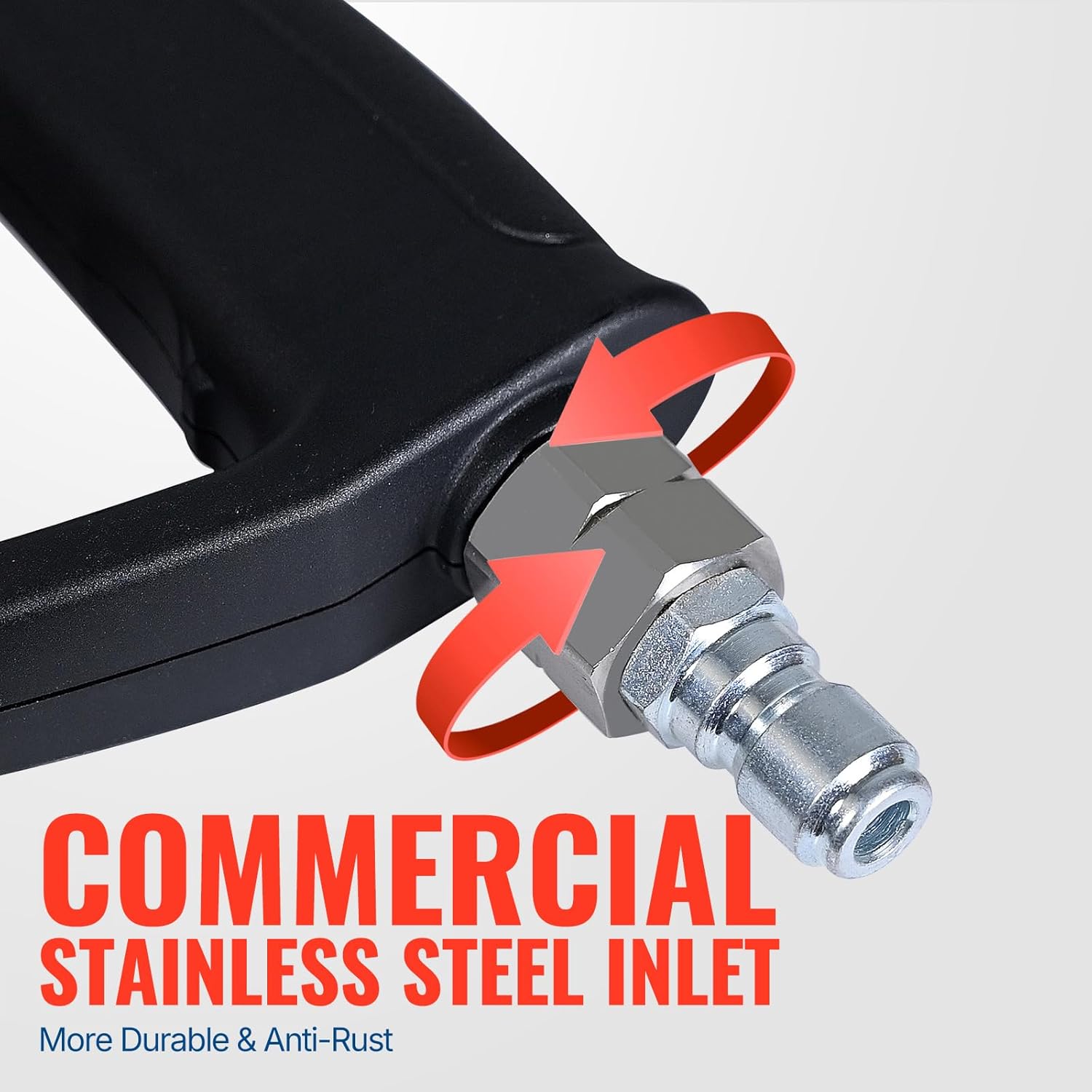 - [Quality Craftsmanship] The pressure washer gun comes with STAINLESS STEEL inlet & 3/8" plug and lock tite, ensuring durability, leak resistance and more durable. 1/4" brass quick connector including teflon tape to prevent leak, easy disconnect. The internal trigger is also crafted with superior quality stainless steel, steel pole connector, and ceramic trigger for low vibration and long working life.