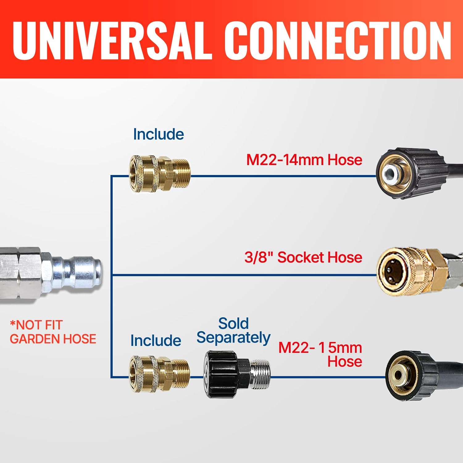 - [360-Degree Swivel Design] Enjoy the benefits of a swivel inlet rotates 360 degrees, preventing power washer hose tangles all the time. This feature makes pressure washing more efficient, allowing you to clean from top to bottom without wrestling with the pressure washer hose. PLEASE NOTE: Not fit garden hose, water hose.