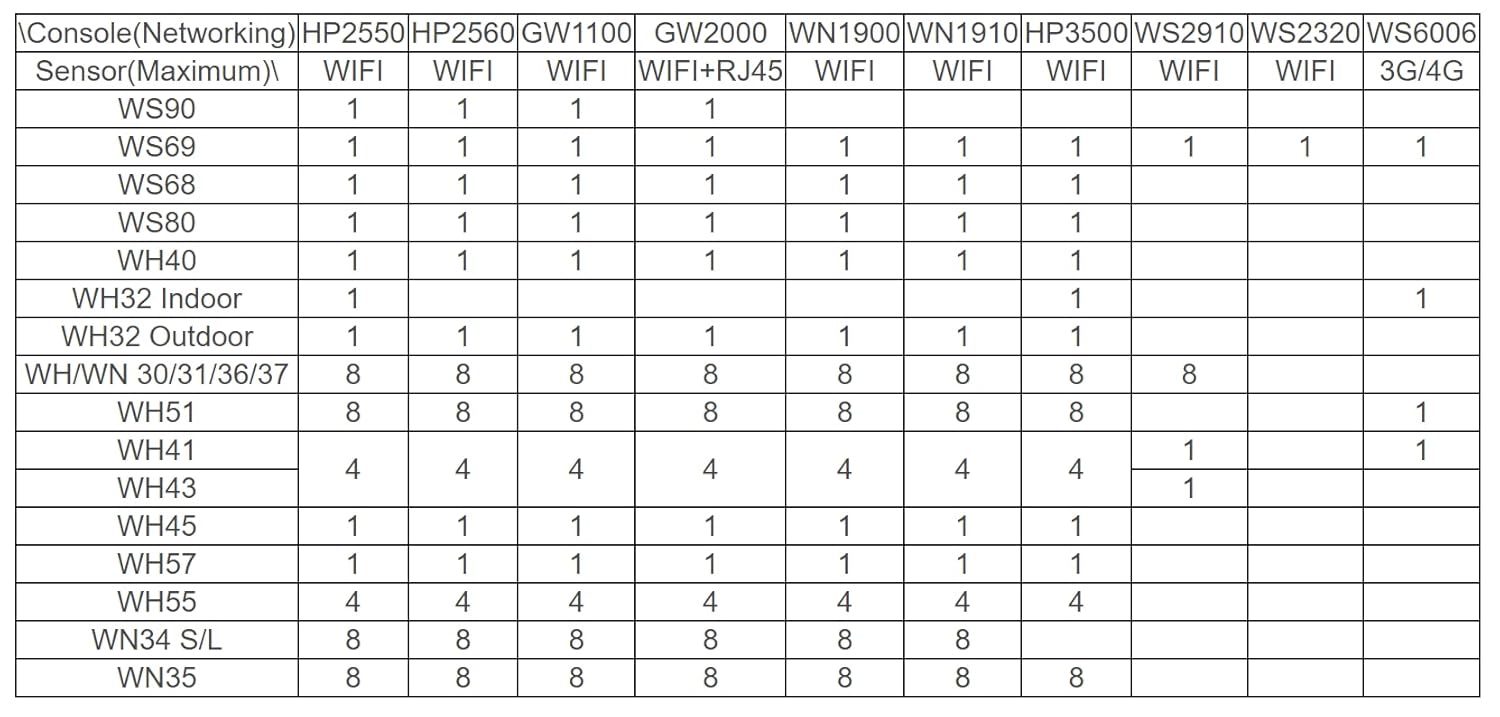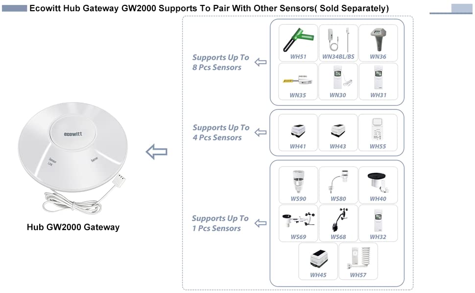 - 【Support Various Ecowitt Weather Sensors】: GW2000 Wi-Fi hub/gateway can collect sensor data from various Ecowitt wireless sensors(sold separately), such as WS90 intergreted outdoor sensor, WH32 outdoor temperature and humidity sensor, WH40 rain gauge sensor, WS68 wireless anemometer, up to 8 WH31 multi-channel temperature and humidity sensors, up to 8 WH51 soil moisture sensors, up to 4 WH41/WH43/ WH45 air quality sensor, WH55 Water leak sensors and WH57 Lightning sensor.