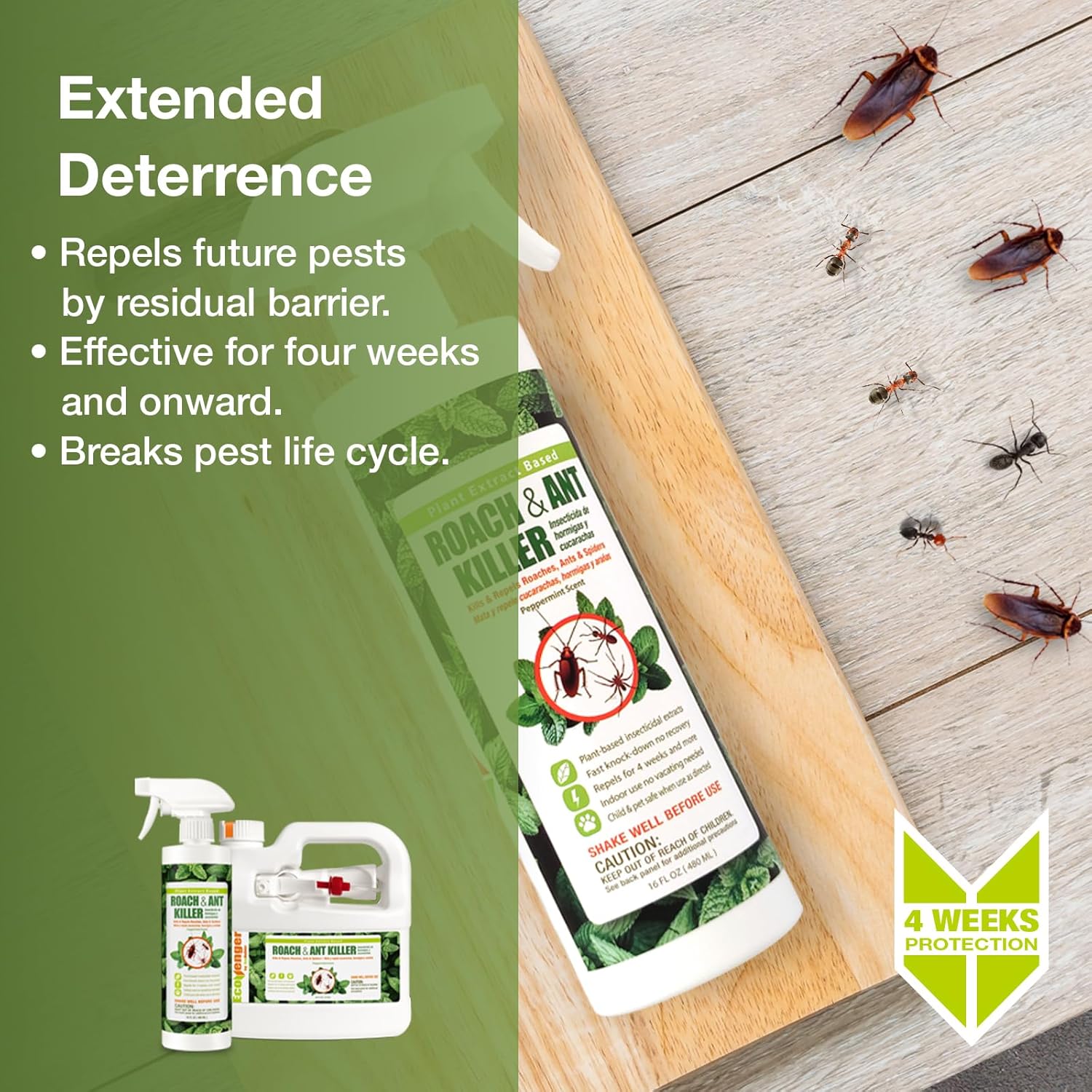 - ELIMINATES ROACHES EFFECTIVELY β Get rid of unwanted roaches in your kitchen, dining room, or food storage areas. EcoVenger kills on contact and repels them for 4 weeks or longer, immediately cutting down roach activity without attracting them like baits do. As one customer raved, "Not one nasty bug has been seen or heard from since we first sprayed."