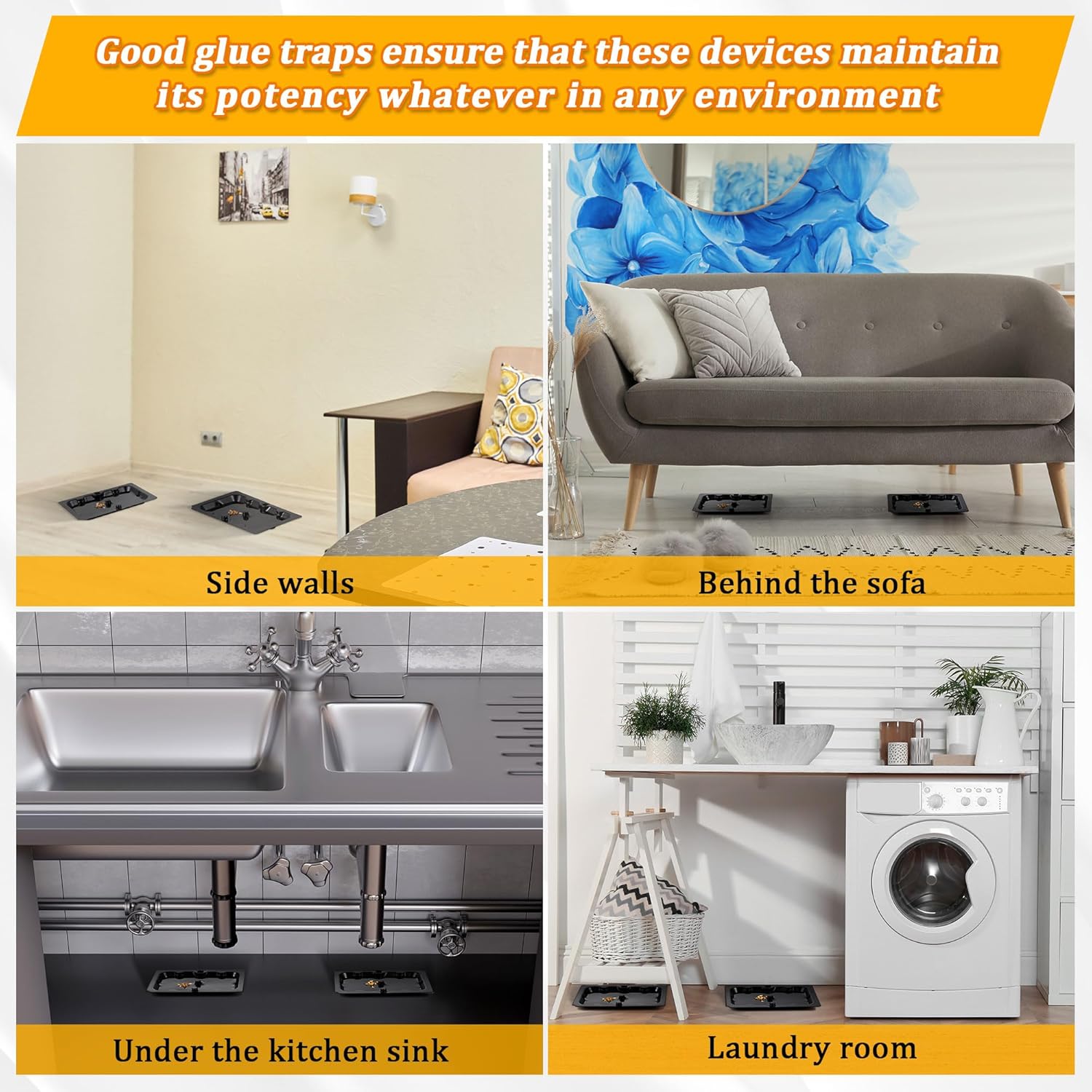 - [Mouse Glue Traps]: Qualirey sticky traps for mice can catch not only mice but also other common pests in your home, and suggested that you position sticky traps along active rodent runways, such as along wall, under large kitchen appliance, in cupboard, and other areas where rodents travel; Be sure to fit the glue trap flush against a wall where rodents will run over and stick to it