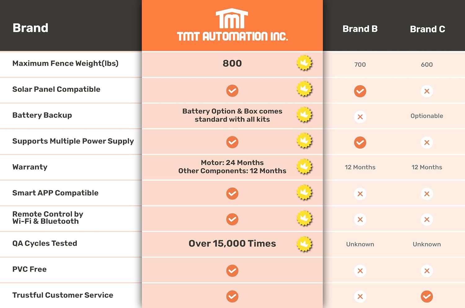 - 【ROBUST MATERIALS CAPABLE FROM -4°F TO 122°F】TMT smart gate openers exhibit superior strength and durability with a high-quality aluminum alloy shell compared to those gate openers with plastic materials. Its design considers harsh weather conditions, ensuring reliable and long-lasting operation in temperatures ranging from -4°F to 122°F.