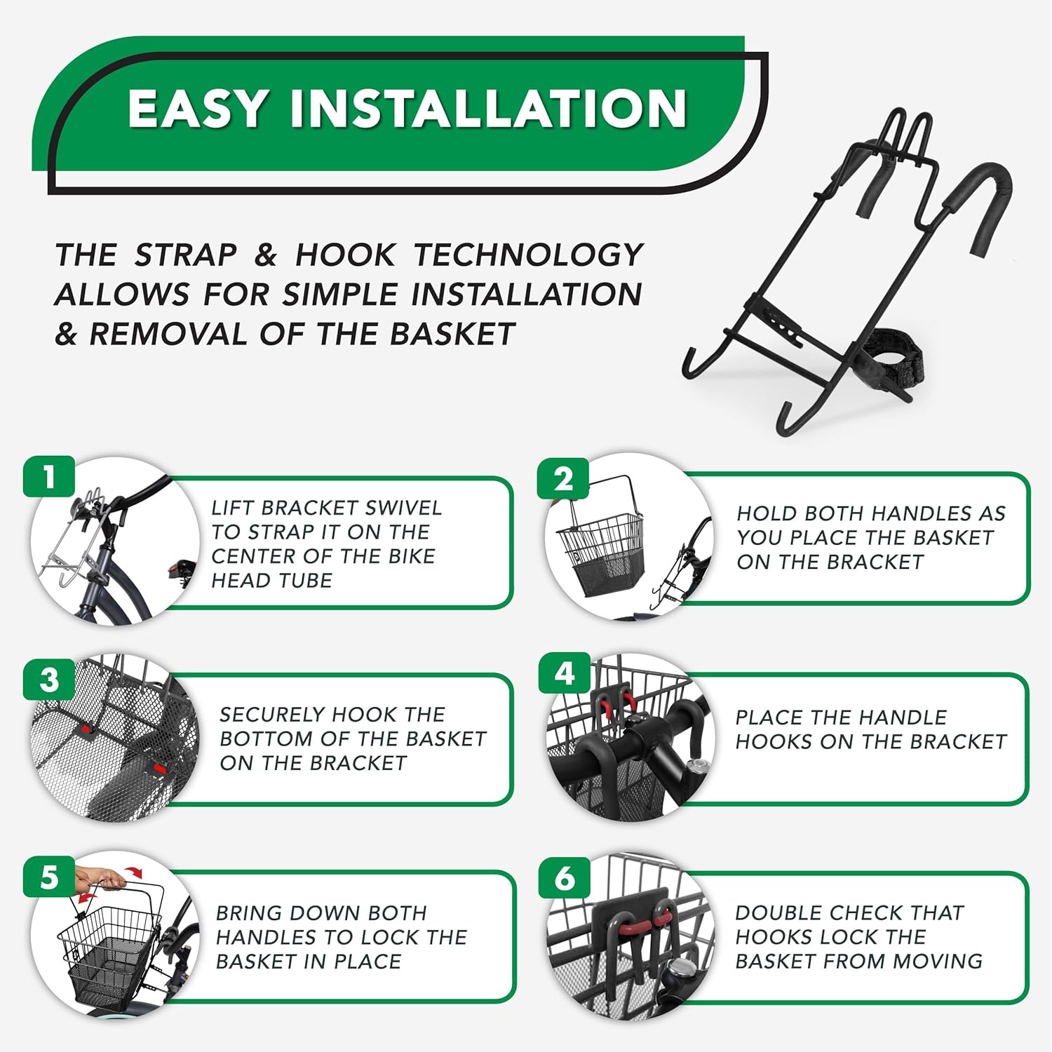 - EASY INSTALL: Attach or detach to the bicycle basket front handlebar with quick-release brackets, integrated hooks and velcro straps. Refer to the instruction manual for guidance