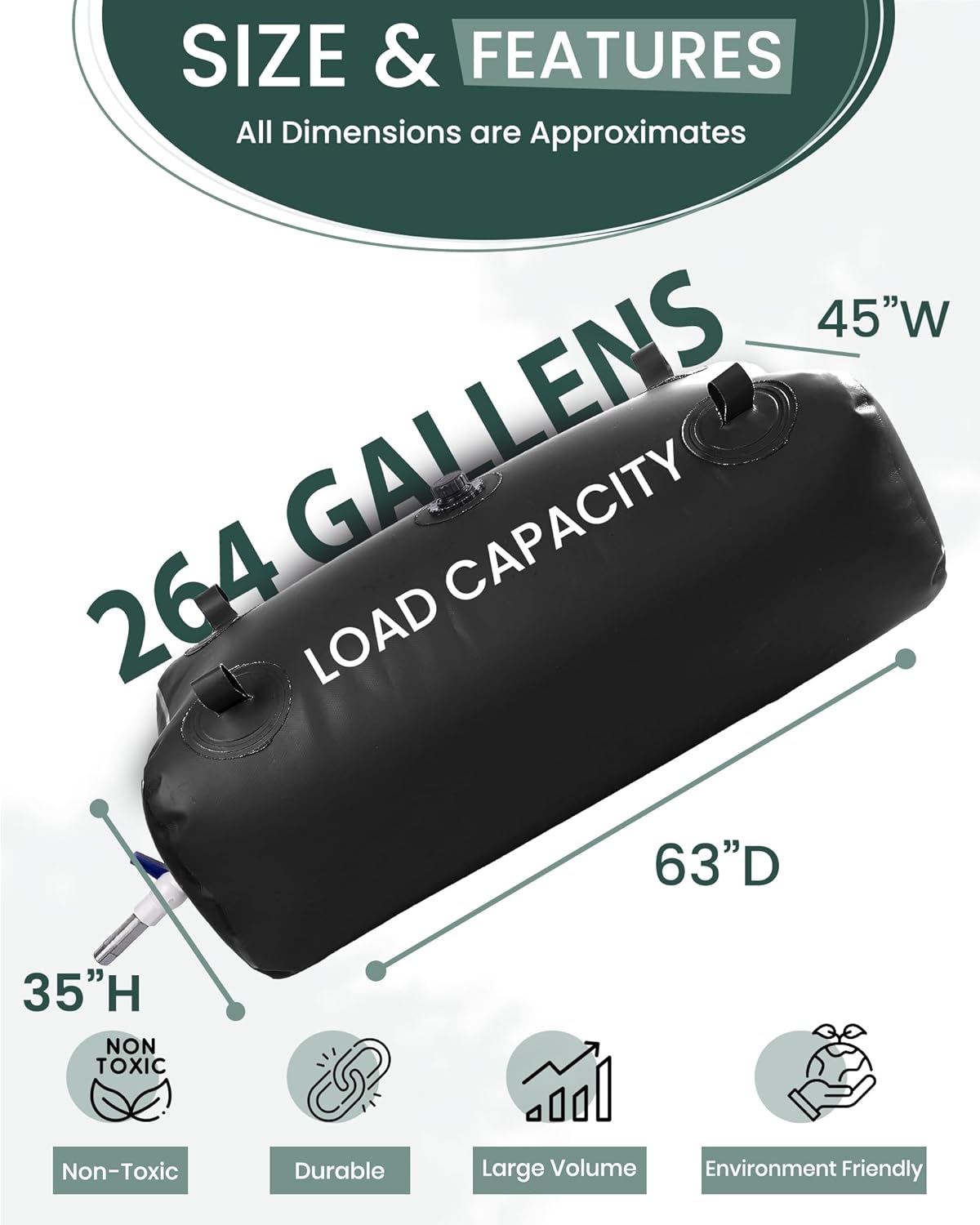 - LARGE CAPACITY: There are five different sizes to choose from, with a maximum water storage capacity of 264 gallons. The different sizes of water storage bags will allow you to be outdoors and not have to worry about running out of water.