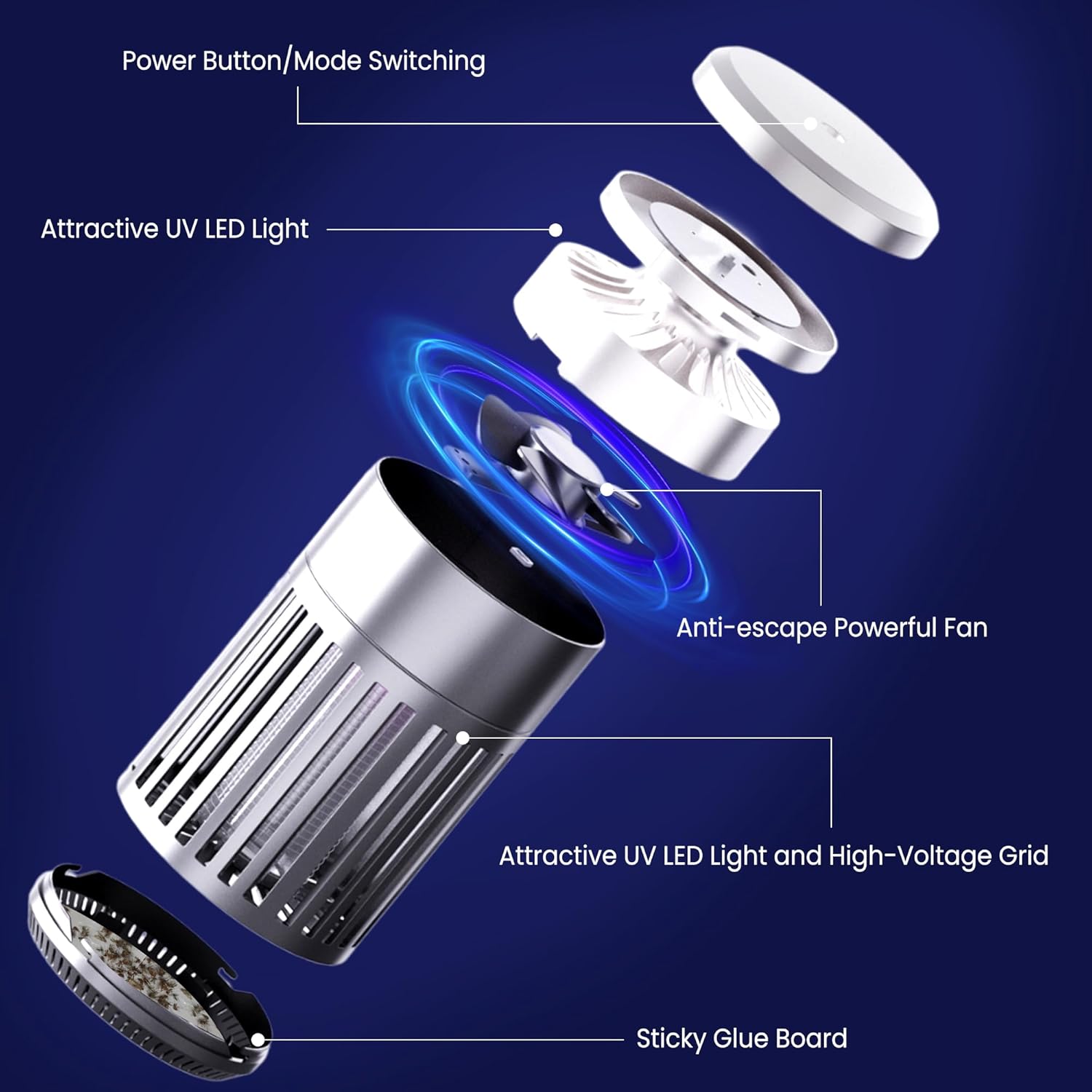 - 3-in-1 device : Features 3 powerful modes for effective pest control. Mode 1 (1 press): Fan + Sticky Paper—top UV light attracts bugs, fan sucks them into the bottom trap (requires included sticky paper). Mode 2 (2 presses): Electric Zapper—middle light lures insects, high-voltage grid eliminates them instantly. Mode 3 (3 presses): Dual Action—both lights, fan, and zapper work together for max coverage and efficiency. Note: Always use sticky paper in fan-involved modes to trap bugs securely.