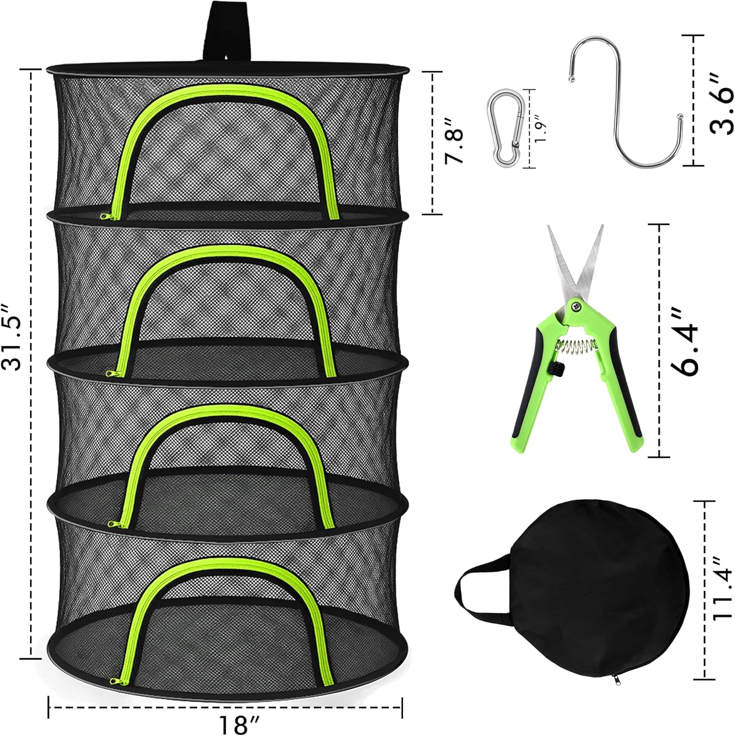 Herb Drying Rack Hanging Mesh 4 Layer 18" with Zipper, Garden Pruning Shear, Hook & Carabiner Clip for Drying Herbs, Plants, Seeds, Buds | Hydroponics & Grow Tents Herb Dryer Hanging Rack