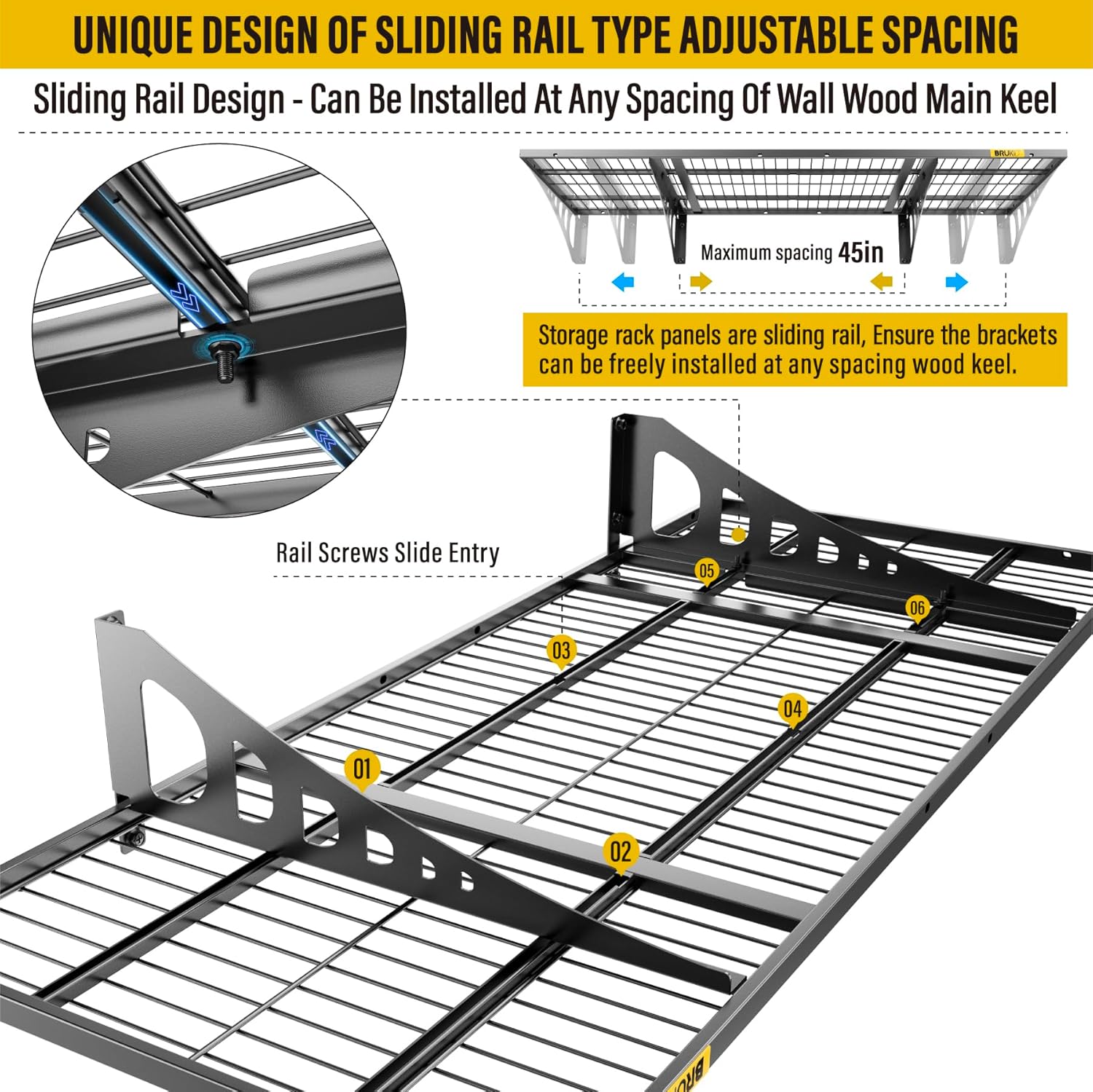 - SUPERIOR DESIGN: Wall shelf garage storage rack is made of heavy-duty frame structure and thicker wire mesh combined with welding, the panel and bracket connection is adjustable slide rail design, Both ends of the bracket can be installed freely in the 8"-45" range of wood wall keel spacing. Eliminating the worry of not being able to connect due to the mismatch of the spacing of the load-bearing wooden wall keel.