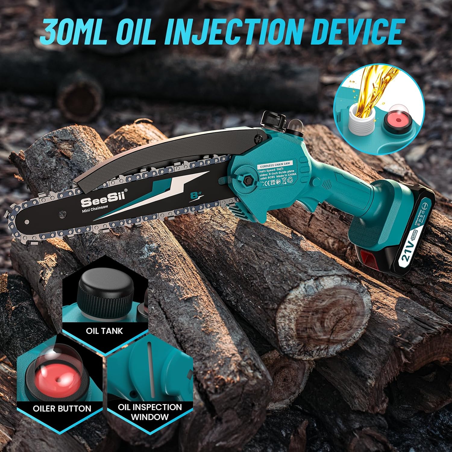 - Automatic Oiling System: Eliminate the hassle of manual lubrication with the SEESII handheld chainsaw's integrated auto oiler system. Simply fill the oil tank, press the oiler button, and let the chainsaw automatically apply oil to the chain, ensuring smooth and efficient cutting. Enjoy the convenience of effortless maintenance and focus more on your cutting tasks with SEESIIโs self-lubricating system