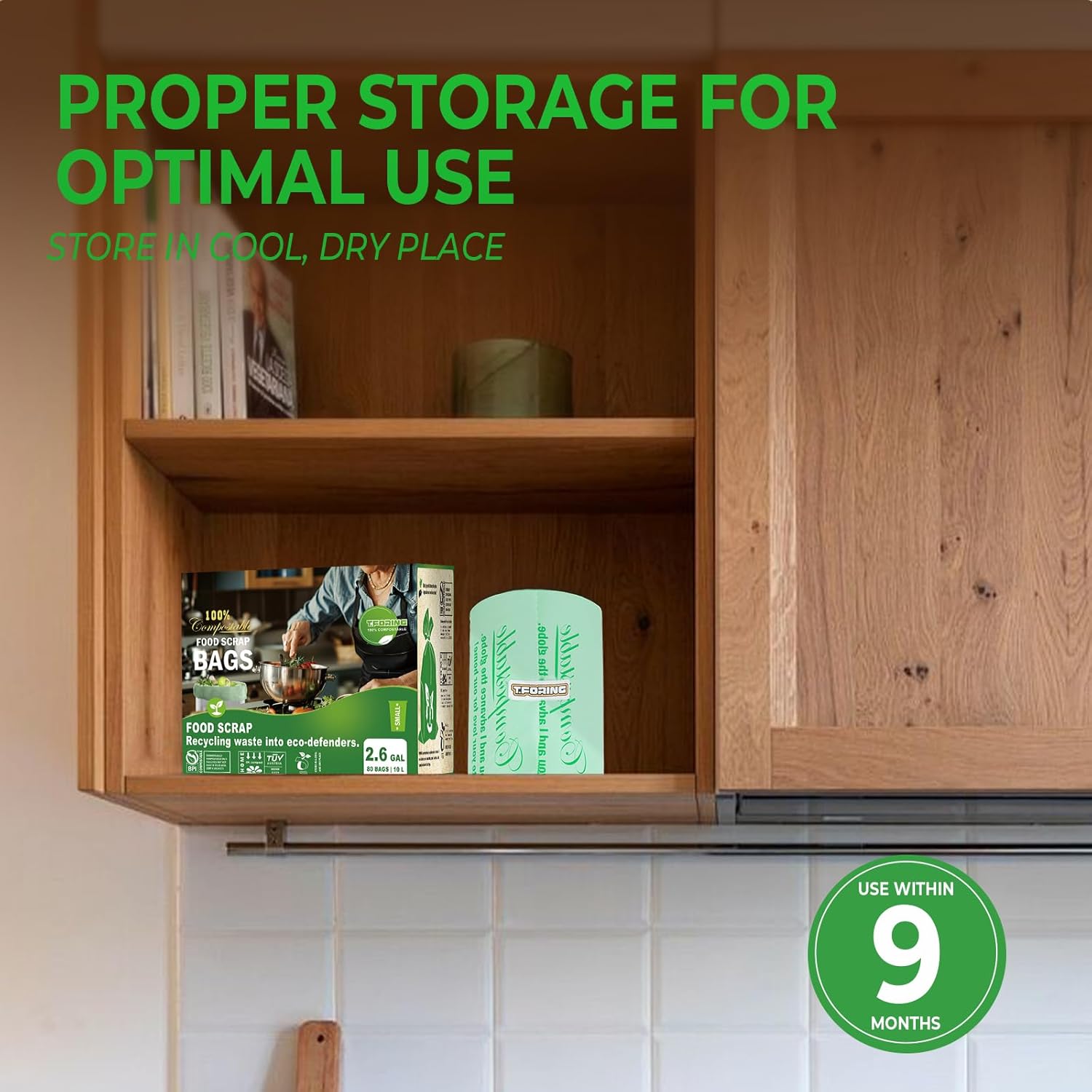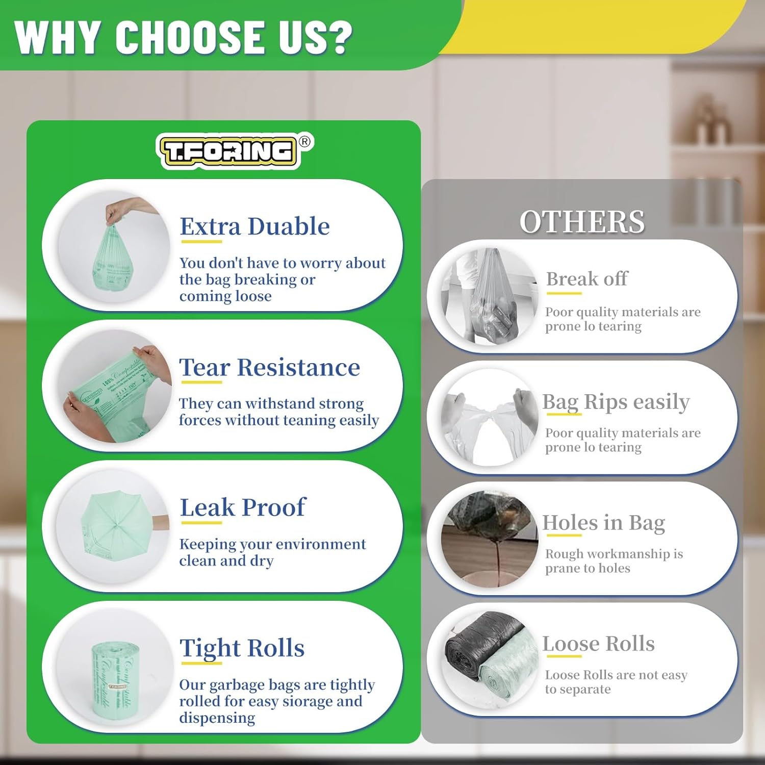 - ăEco-friendly for EnvironmentăT.FORING compostable bags are made from corn starch and plant-based materials,no polyethylene.Bags are durable, nontoxic, easy to use and great for the environment.T.FORING 2.6 gallon trash bags decomposes fully into CO2, water and organic biomass after 6-12 months, leaving no traces of plastic in the environment.