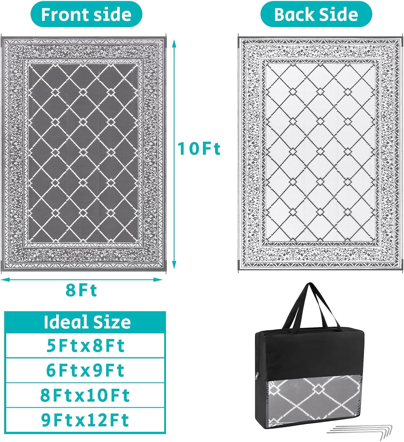 - Versatile Outdoor Carpet: The indoor outdoor plastic rugs have multiple choice in different colors(4'x6',5'x8',6'x9',8'x10',9'x12',9'x18',8'round), is ideal for a variety of indoor outdoor activities,like patio mat, deck rug, garden rug, beach mat, picnic mat, BBQ party mat, rv camping rug,pool rug,outdoor doormat,garage rug,front door mat,allowing you to have plenty of imaginable space for more fun.