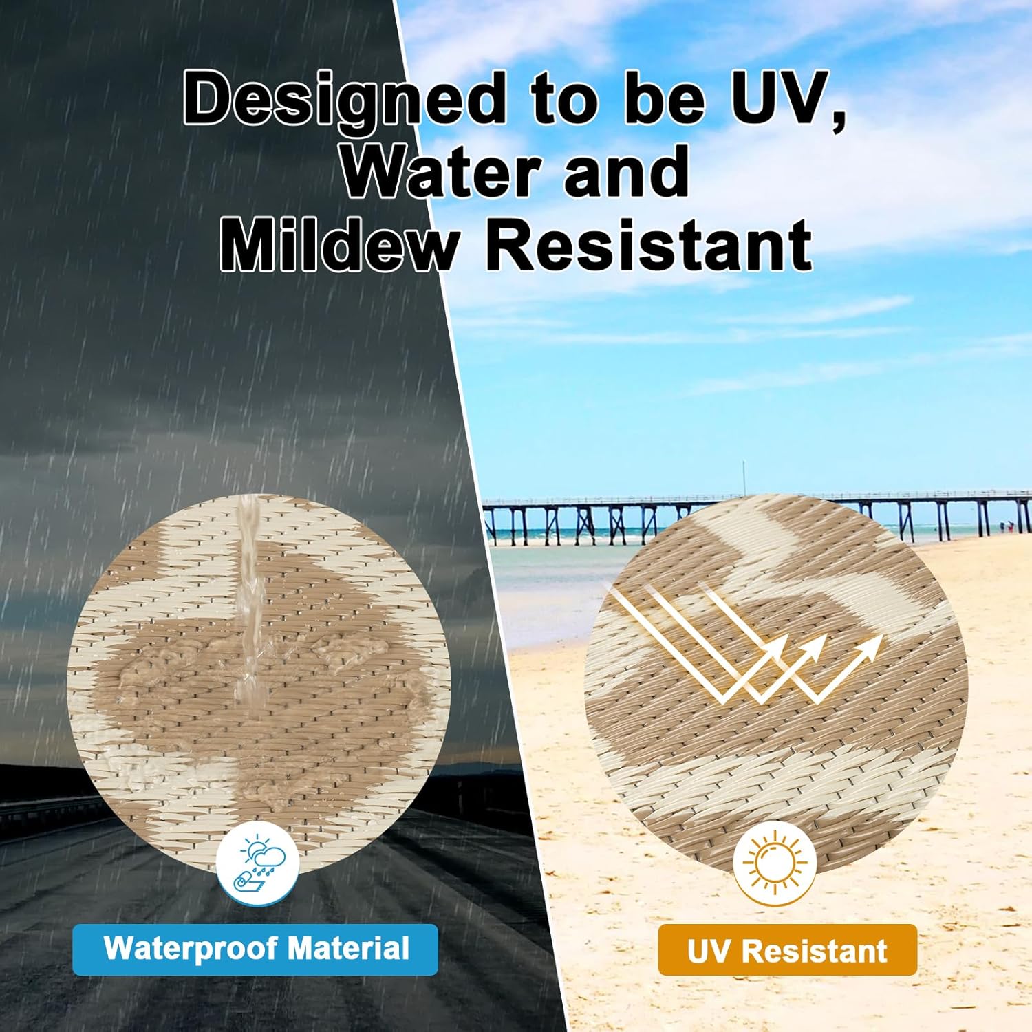 - UV-Protected & Weather Proof Patio Mat: A UV coating guards against fading so colors remain vivid, while the reinforced edges prevent unraveling and withstand frequent use. The fused hems lend added durability.The circle outdoor plastic garden rug door mat is ideal for a variety of spring summer autumn outdoor activities all year round.