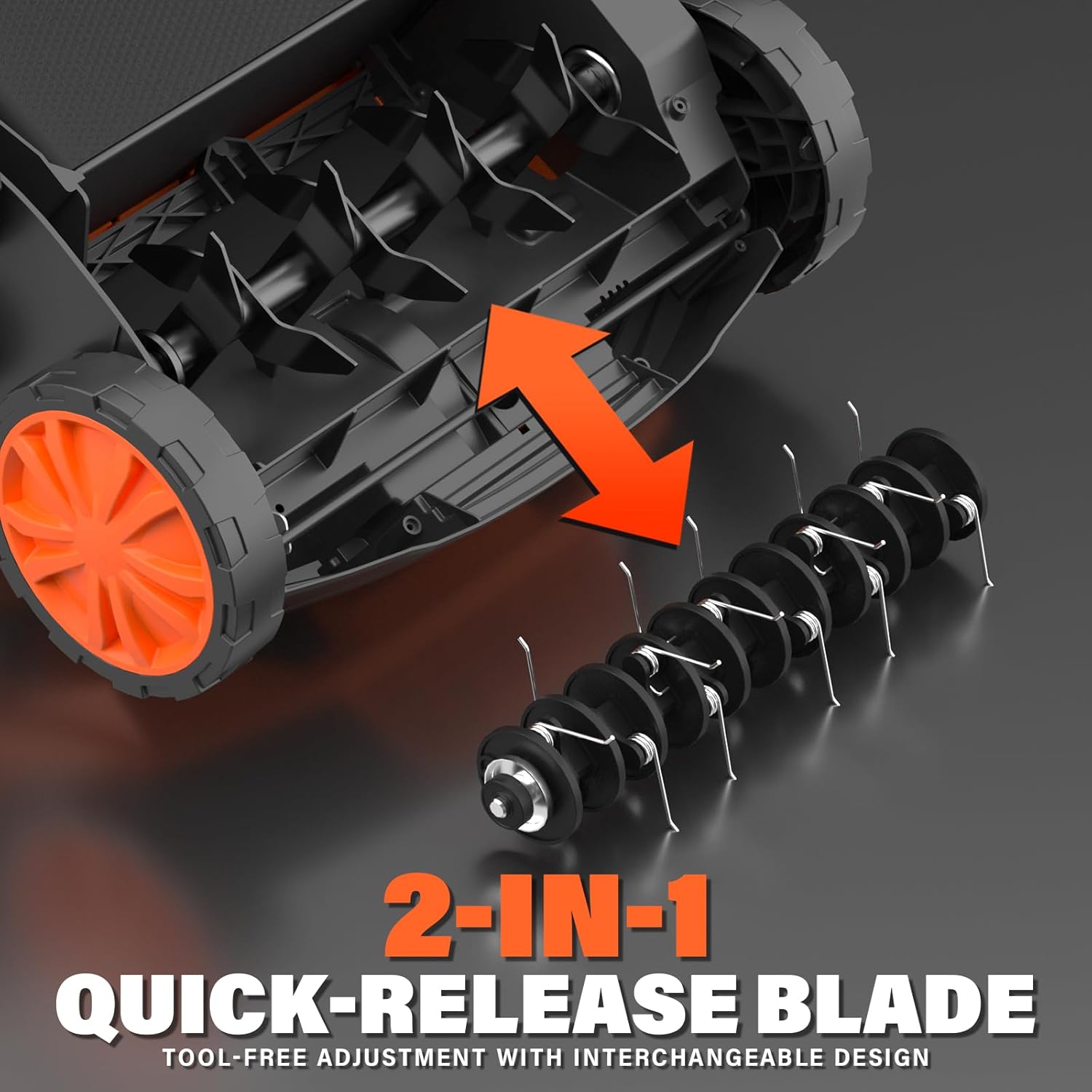 - Double Safety Switch: Keep yourself safe while operating the electric dethatcher thanks to its dual safety switches that prevent accidental starts. Plus, the foldable handle makes storage a breeze!