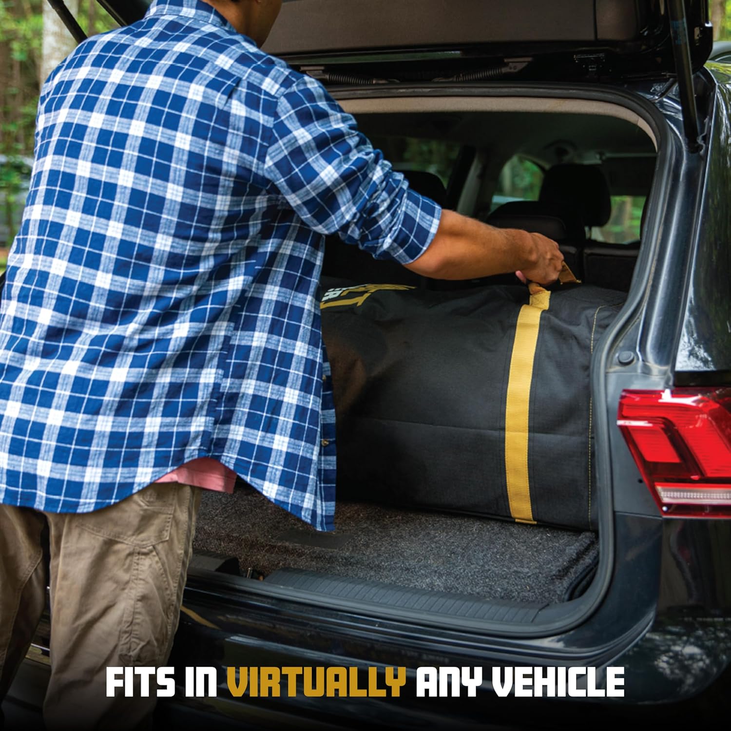 - [𝗨𝗹𝘁𝗿𝗮-𝗣𝗼𝗿𝘁𝗮𝗯𝗹𝗲 𝗗𝗲𝘀𝗶𝗴𝗻, 𝗣𝗲𝗿𝗳𝗲𝗰𝘁 𝗳𝗼𝗿 𝗧𝗿𝗮𝘃𝗲𝗹] : Built Tough, Packed Small. Folds to 41", fitting in any vehicle, unlike larger pop up canopy options. Our weatherproof canopy comes with the Roller Wheel Bag & Tie Down Kit with heavy duty handles, storage pocket, and strong roller wheels for easy transportation and setup. The Compact Shelter can fit in most car trunks easily for your next event.