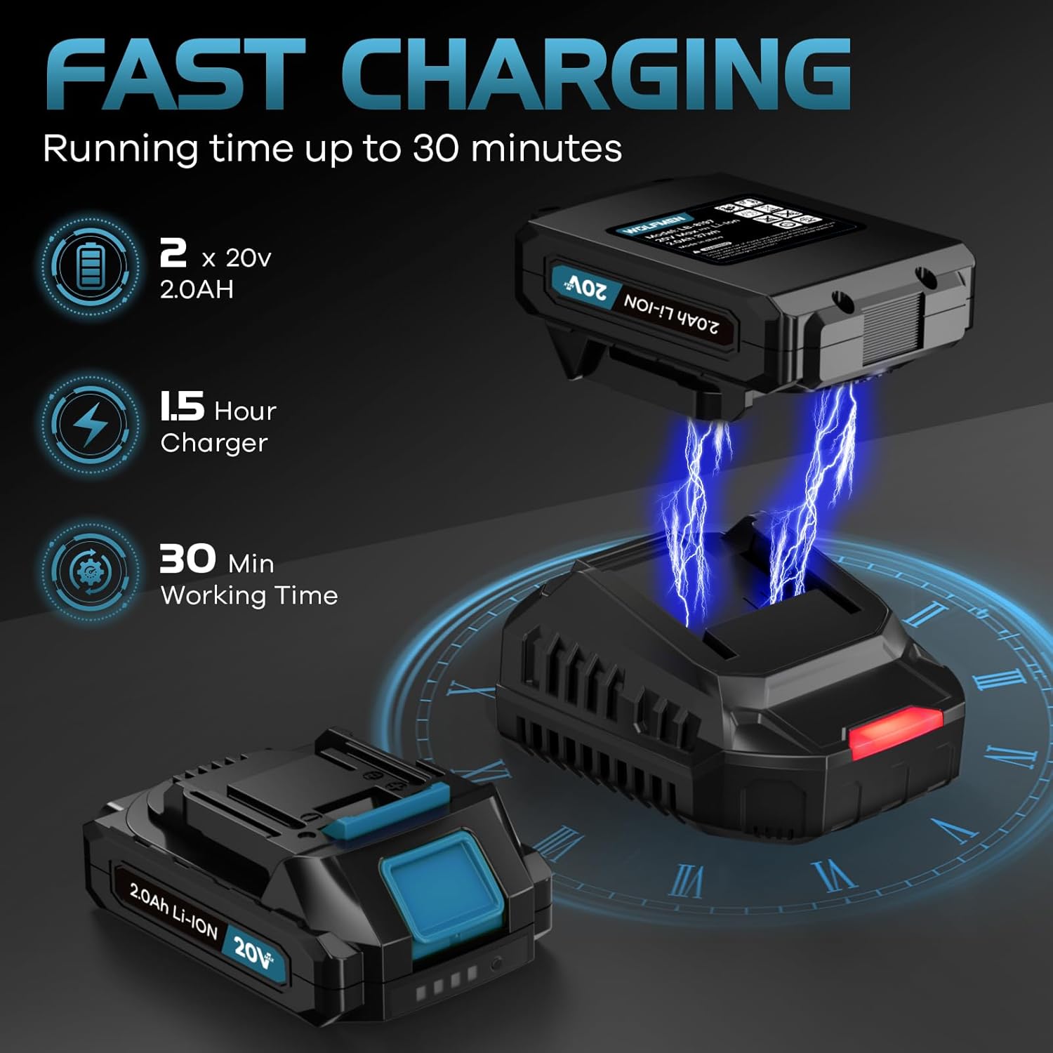- Powerful Motor: WOLFMEN leaf blower adopts advanced axial flow turbofan, up to 450 CFM and 150 MPH, effectively improving air volume and wind power. It is equipped with a charger and 2 x 20v 2.0 Ah batteries, which can be used alternately. Each battery can work for up to 30 minutes (low speed)