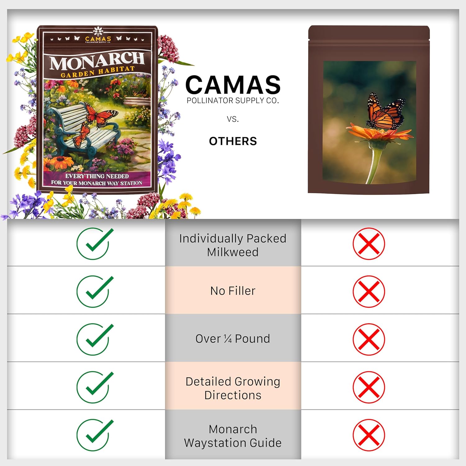 - At Camas Pollinator Supply, our milkweed seeds are carefully separated for unique growing needs, including cold stratification, ensuring better success in your butterfly garden. Our seed packets also include a FREE e-book that teaches you how to grow milkweed from flower seeds to plant outside and register a certified Monarch Waystation. Perfect gift for the gardeners in your life, wildflower lovers and anyone looking to enhance their garden with high-quality garden seeds.