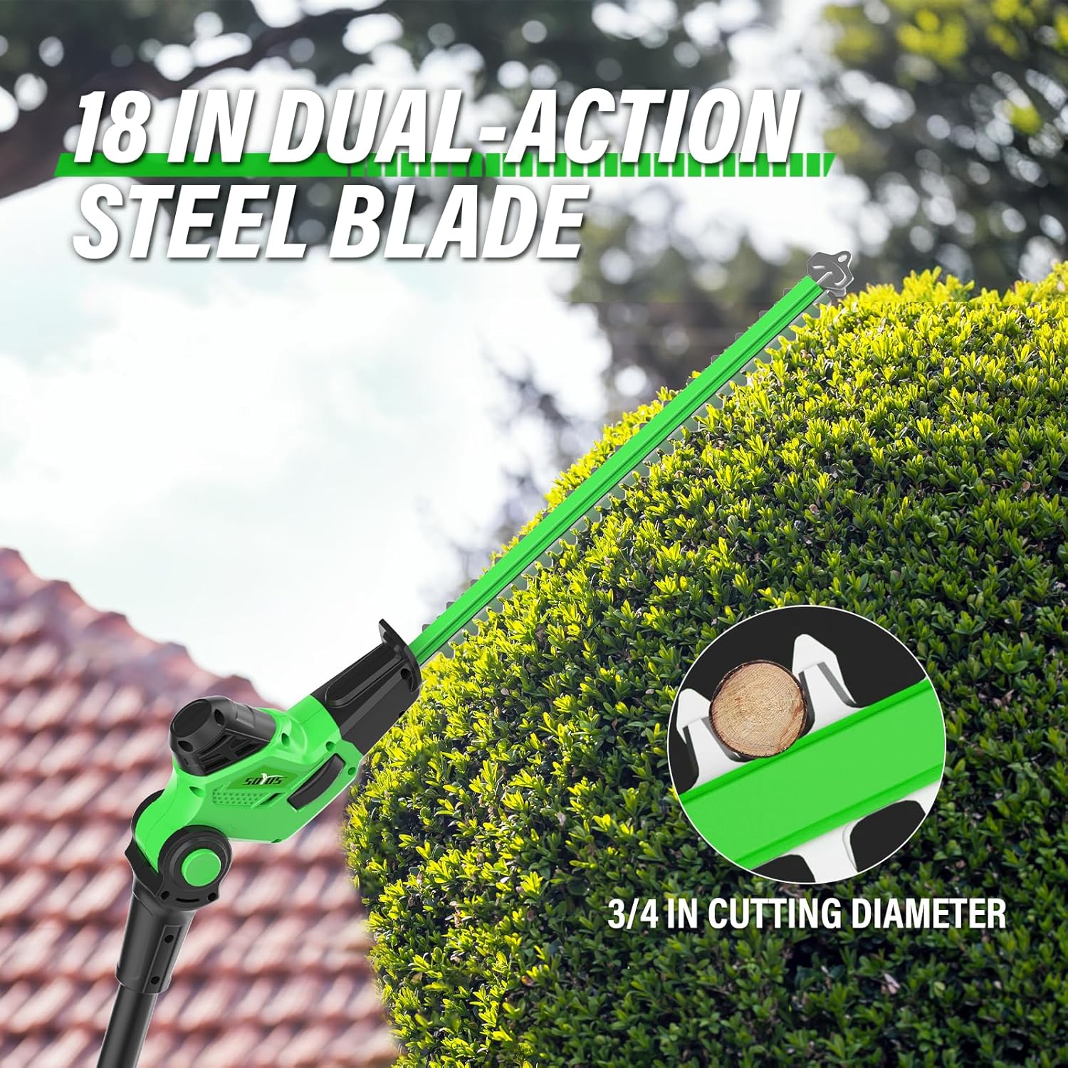 - [SUPER CUTTING CAPACITY] The 18-inch double-action laser cutting blade brings you a highly efficient hedge trimming experience, allowing you to reduce vibration during smooth cutting. The 3/4-inch cutting spacing accommodates pruning needs of different branch sizes. It is a good helper for you to trim your hedges.