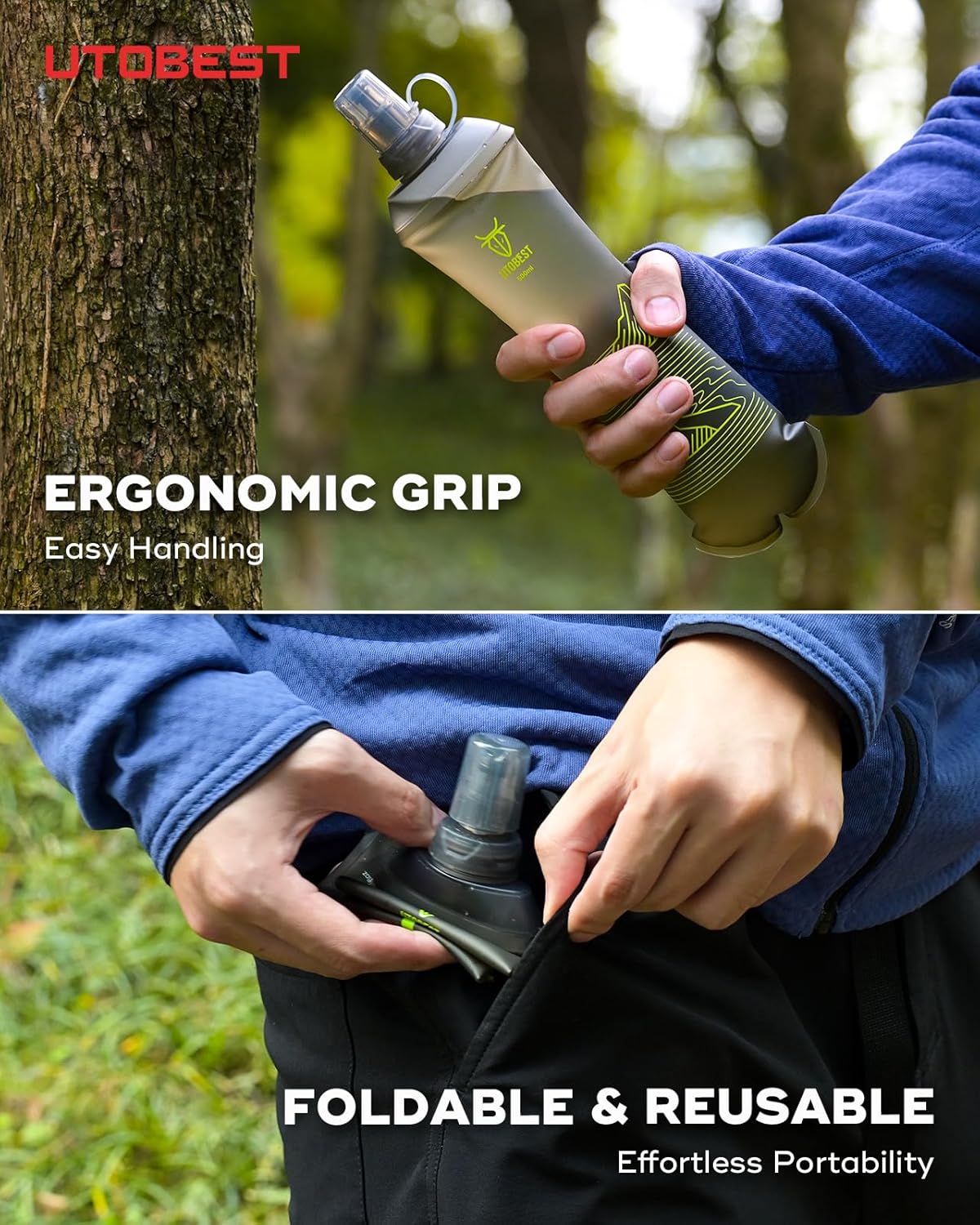 UTOBEST 500ml Soft Flask, 2 Pack Flexible TPU Hydration Water Bottle, Collapsible with 28mm Caliber for Running, Hiking, Cycling, Climbing, and Marathon Green