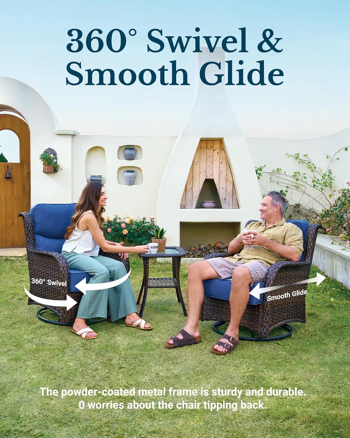 HILLGA Luxury Patio Furniture Set with 6-inch Thick Cushion, Outdoor High Back Swivel Rocker Patio Chairs, 3PCS Wicker Conversation Set for Deck Yard and Poolside, Blue (V2)