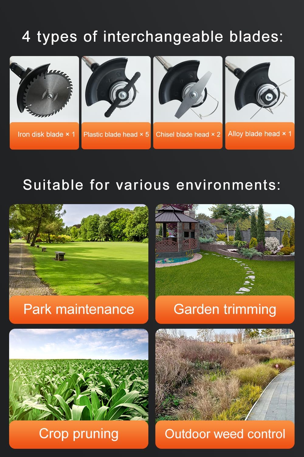 - 【Deluxe Accessories and Service】Included accessories for the cordless weed wacker are: 1x lawn mower unit, 1x circular saw blade, 5x plastic blades, 2x chisel blades, 1x grass cutting head, 2x large-capacity batteries, 1x charger, gloves,a front handle, 2x wrenches, and an English user manual.