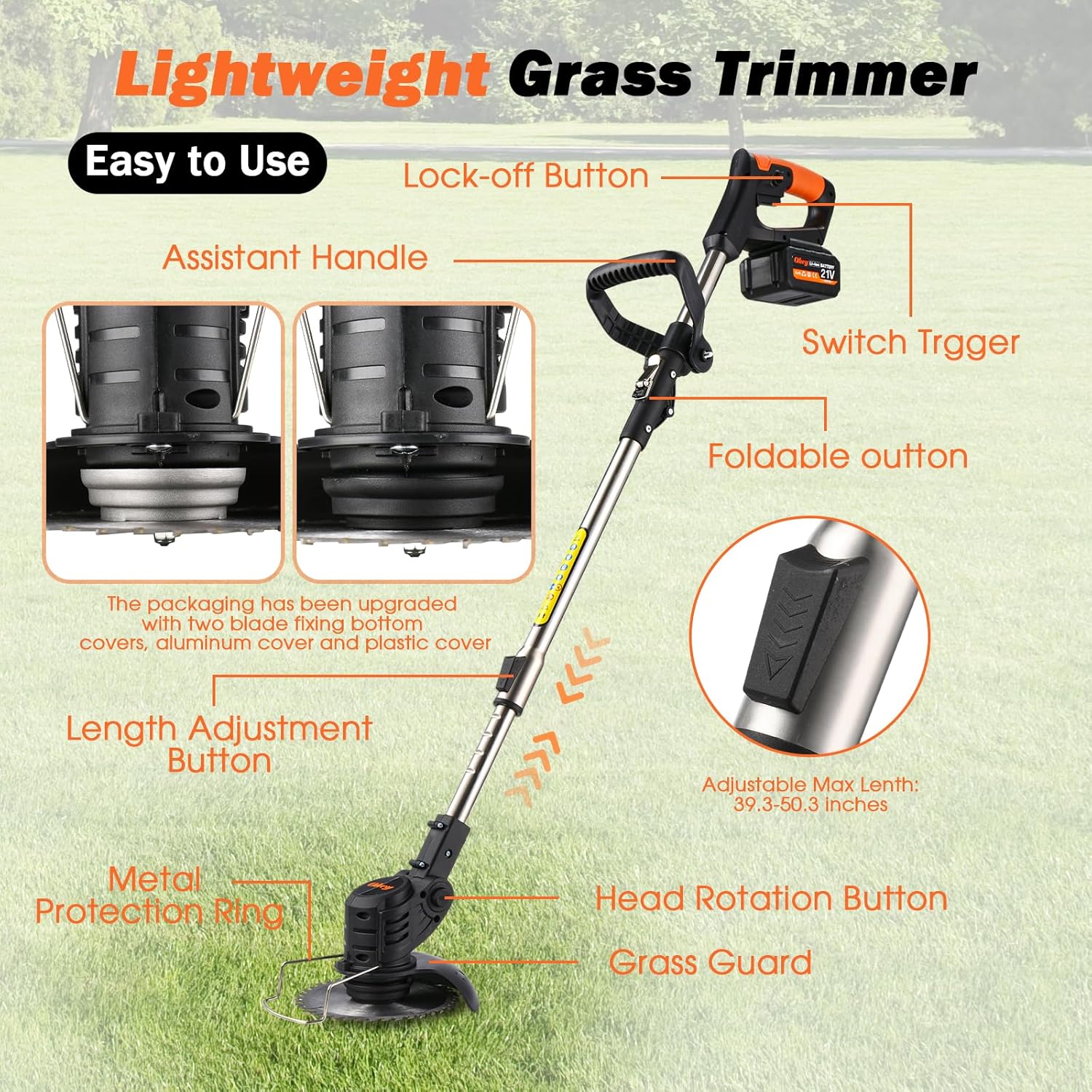 - Versatile Blades for Every Job: This electric weed wacker comes with three types of blades: plastic blades for young grass, steel blades for tougher lawns, and saw blades for thicker shrubs and twigs. Whether you're edging your garden or cutting through dense brush, this cordless brush cutter adapts to every task with ease.