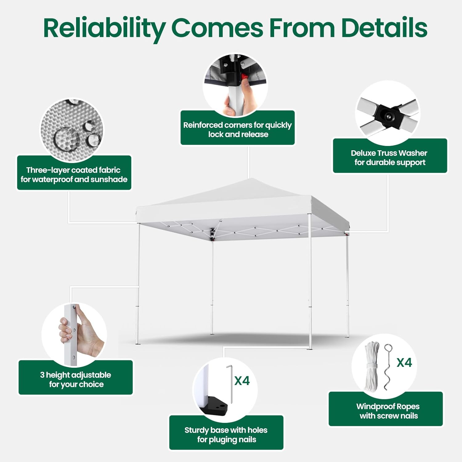 10x10ft Pop Up Canopy Tent,Heavy Duty Waterproof Folding Tent for Camping Parties Events Parties,Outdoor Canopy,Portable Sun Shelter,3 Adjustable Height(White)
