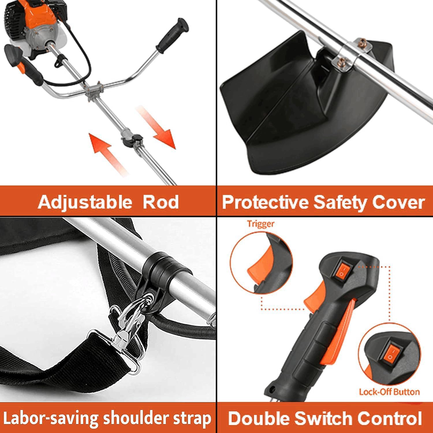 - Multi-Tool Accessories: This gas weed trimmer is equipped with 4x cutting heads, 1x extra start pull rope, 1x extra spark plug for replacement, 1x plastic mixing bottle for mixing fuel, 1x shoulder strap for balance, 1x safety guard for protection, 1x tool kit for installation, 1x product manual