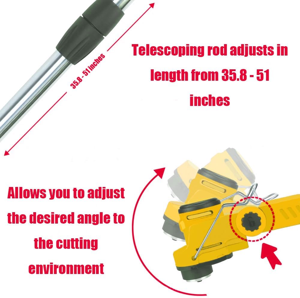 - 🌸【Adjustable Telescopic Design】:Electric Cordless Weeder has an adjustable telescopic pole that can be freely adjusted between 36 and 52 inches, providing everyone with the length they need to work in a comfortable position, reducing stress on the back and shoulders also easy to transport and store. The angle of the cordless weed whacker head can be adjusted from 0 to 90 degrees, allowing you to mow even sloping lawns or hard-to-clean crevices