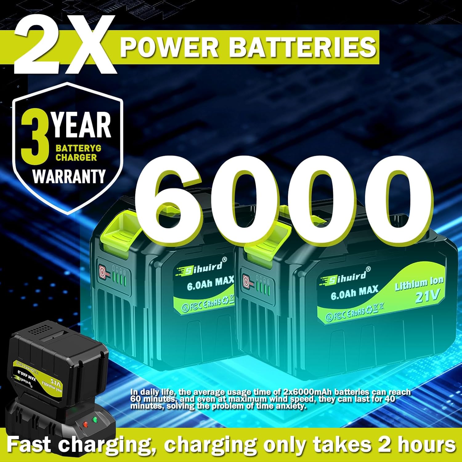 - ăUpgrade to 2x6.0Ah Batteriesă:Sihuird Cordless Leaf Blower Equipped with 2x6.0Ah batteries and a fast charger, In daily life, the average usage time of 2x6000mAh batteries can reach 60 minutes, and even at maximum wind speed, they can last for 40 minutes, solving the problem of time anxiety.