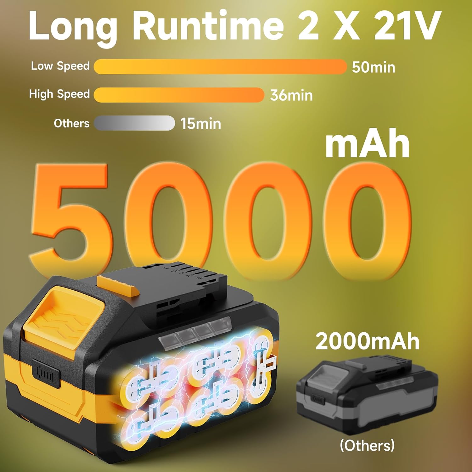 - Upgrade to 2 × 5.0Ah Batteries: Our leaf blower cordless features 2 high-capacity 5000mAh lithium batteries and a fast charger, offering a working time of up to 50 minutes (25 minutes for each battery) on low speed and 36 minutes (18 minutes for each battery) on high speed. The included fast charger fully charges the battery in under 2 hours