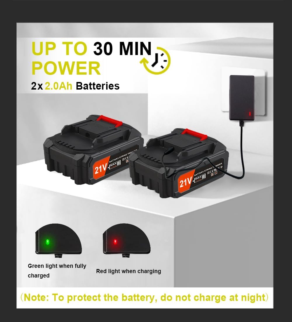- Super Long Battery Life:The weed wacker battery powered comes with two high-capacity 2000 mAh batteries. One battery can run for at least 30 minutes, while one can be charged in just 2-3 hours. Tip: Fully charge the device before first use to achieve the expected operating time