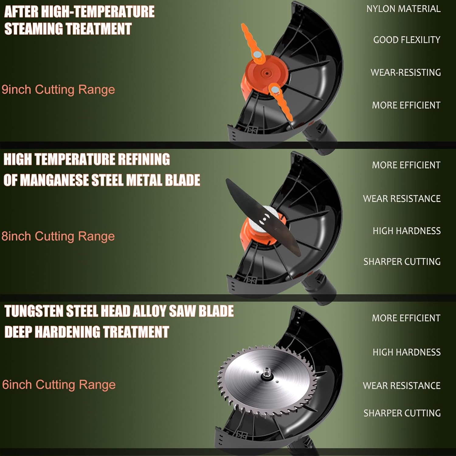 - Multifunctional Brush Cutter: 3-IN-1 cordless grass trimmer has different blades to meet different weeding needs. The upgraded plastic blades are suitable for trimming soft lawns(battery grass trimmer); 8-inch stainless steel blades are well for older weeds, reeds, etc pruning(stringless weed trimmer); Alloy saw blades are great for branches, etc cutting(cordless brush cutter). The electric grass trimmer battery powered is ideal for trimming around yards & bushes, lots, flower beds, and walkways