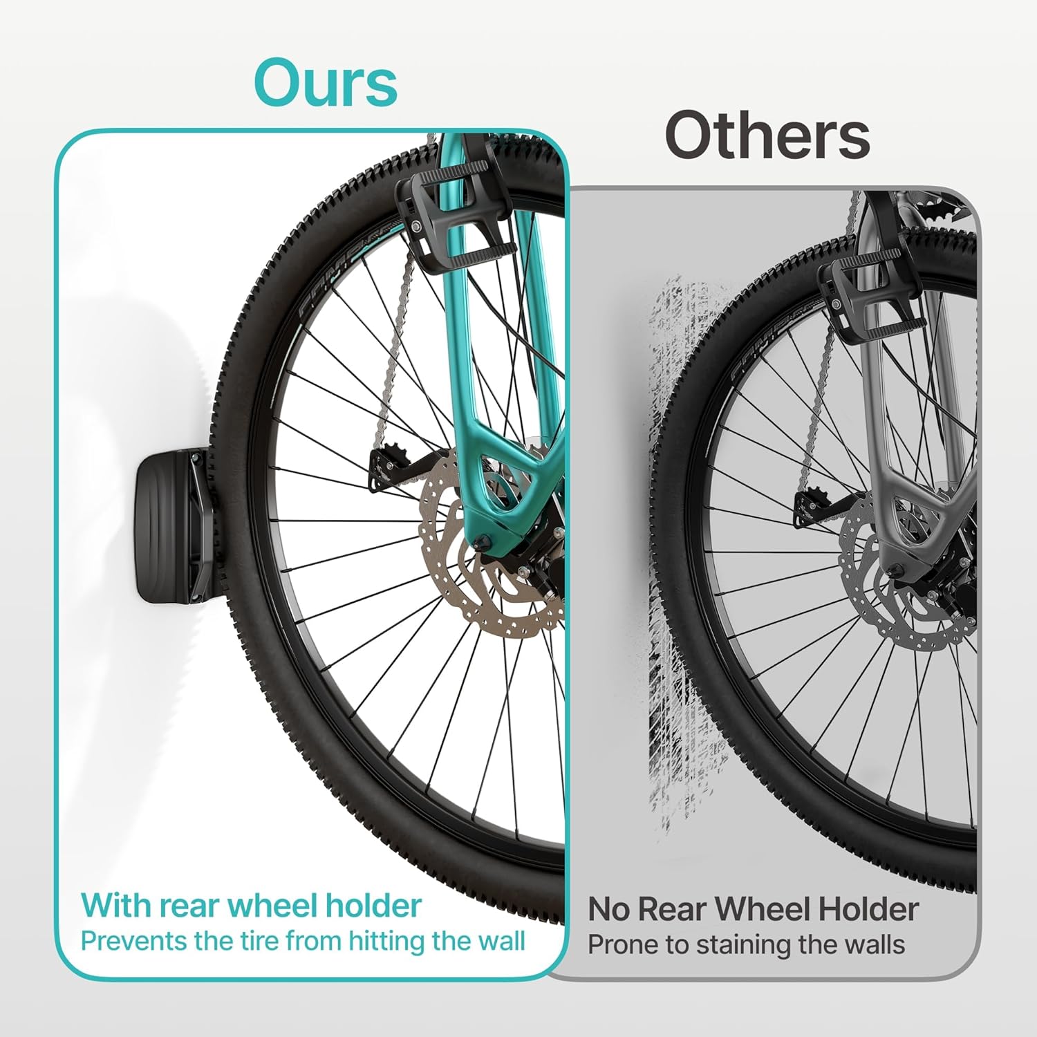 - 【Safe Indoor Bike Storage】Designed to support up to 35 kg, this bike wall mount features premium metal that is 30% thicker, enhancing its strength and durability for greater stability compared to most bike racks. The streamlined, thickened rubber provides excellent support and shock absorption, protecting your bike from scratches and keeping it securely in place. This combination offers a seamless and reliable wall-mounted bike rack storage solution.
