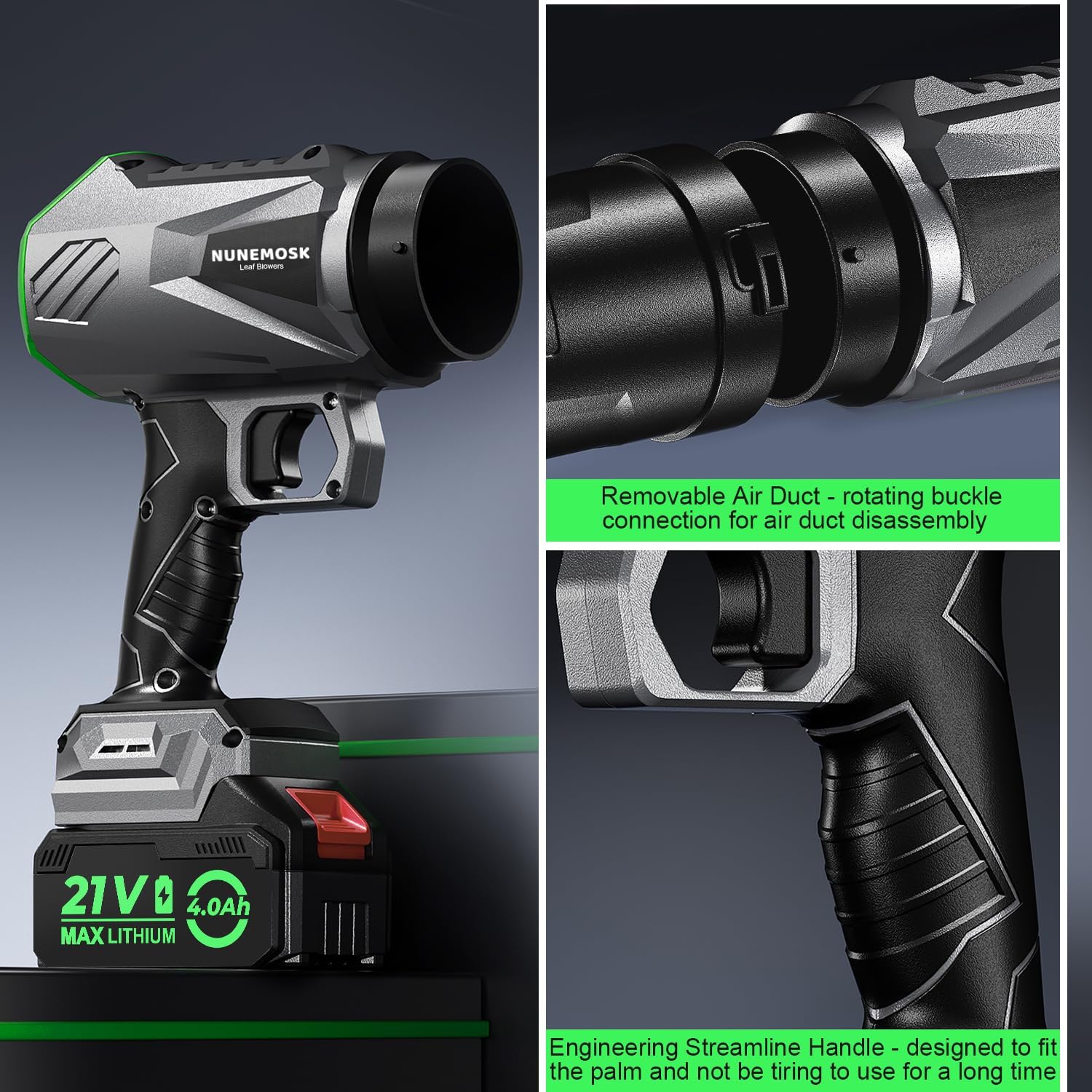 - ăLightweight DesignăThe lightweight leaf blowers weighs only 1.4 pounds, plus a 2.6 pound battery, designed for one handed operation. The compact and lightweight design of the leaf blower makes it easy to store and carry, making it perfect for indoor and outdoor cleaning tasks. Nunemosk cordless leaf blower can be assembled in minutes, just install two nozzles and a battery to start the leaf blower. Small leaf blower offers 50 minutes of low-speed mode and 15 minutes of high-speed mode.
