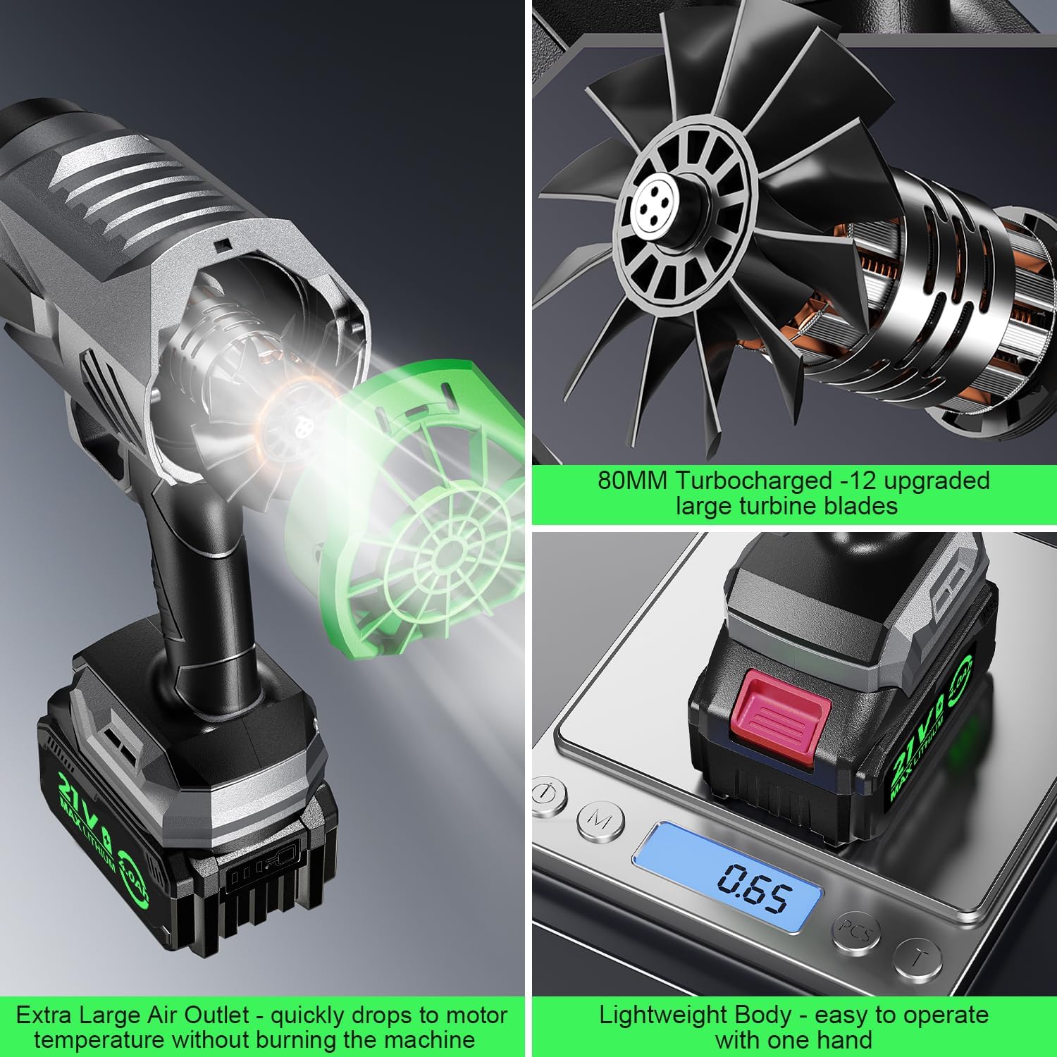 - ăAdvanced Powerful MotorăLeaf blower is designed with pure copper battery cells and high-speed brushless turbo motor, strong power, efficient work, stable operation, and long lifespan. Electric leaf blowers comes with a 1 hour fast charger and 2 x 21v 4.0 Ah batteries, which can be used alternately. Leaf blower cordless with battery and charger is also thoughtfully equipped with goggles and earplugs, great tool for quick patio and lawn jobs!