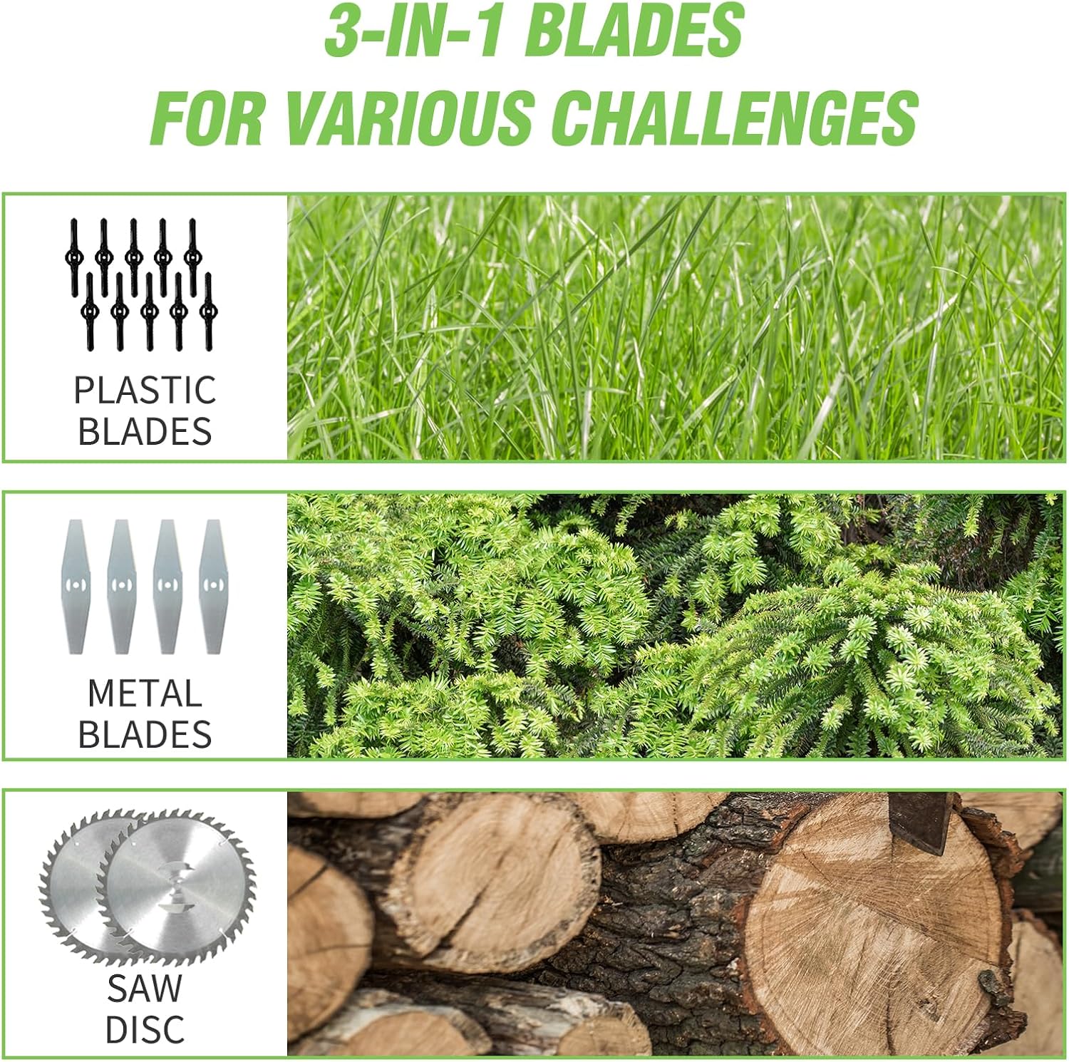 - Complete Kit with 2 Batteries & Accessories: Get everything you need in one box: 1 cordless weed wacker, 2 batteries, 2 round alloy saw blades, 10 plastic blades, 4 alloy blades, 2 wheels, 1 charger, plus 1 safety goggles and 1 pair of gloves for full protection. A ready-to-use electric weed trimmer set for hassle-free lawn care